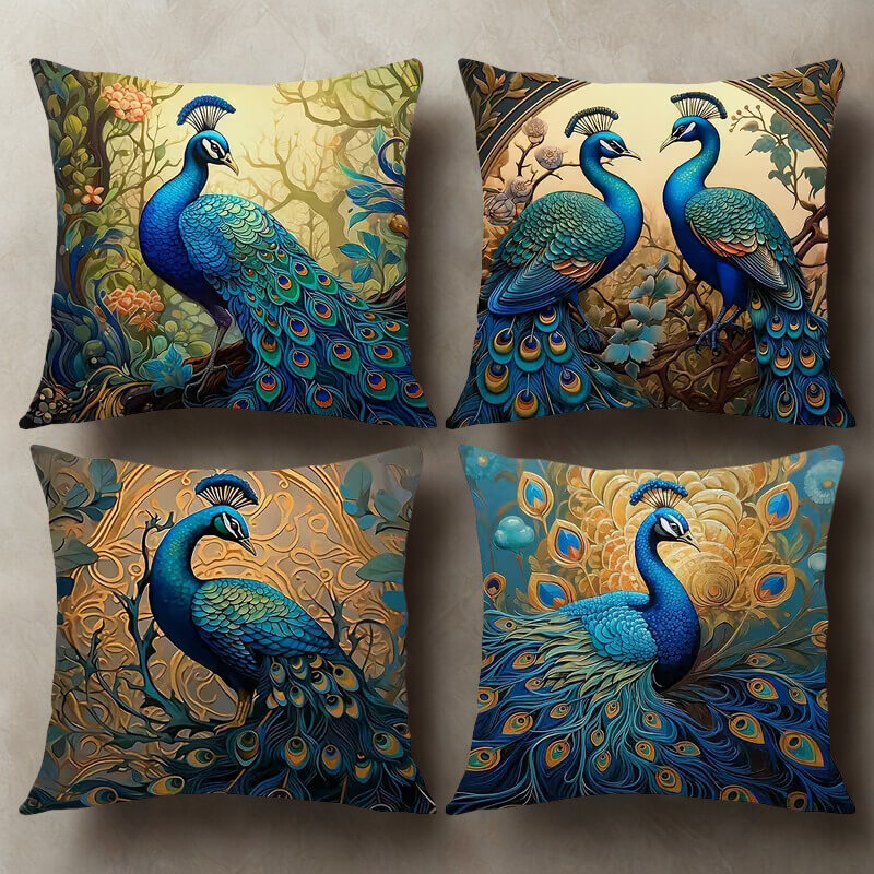 Zestaw 4 poszewek na poduszki z motywem pawia w stylu retro